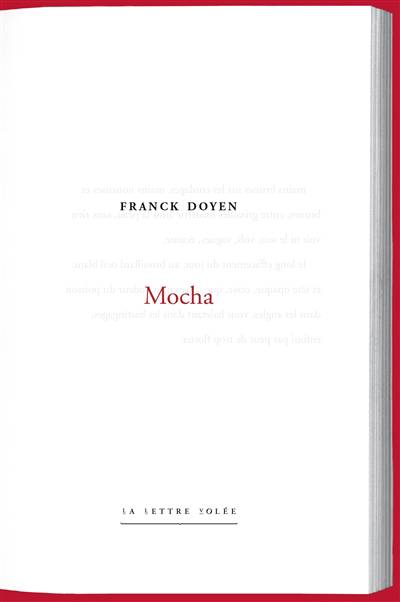 Cette suite poétique de Franck Doyen signale une transformation importante de son écriture. si les livres précédant témoignaient d'une confrontation avec les mots et groupes de mots, de la tension à la naissance de leur affrontements, ce dernier livre s'inscrit certes dans la continuité des collines, ratures, publié en 2016 dans cette même collection « Poiesis », dont la particularité était, notamment, un affrontement avec la page, plus précisément, avec la disposition sur la page des vers, des fragments. Le lecteur retrouvera la structure visuelle à l'oeuvre déjà présente dans collines, ratures, ses fragmentations en paragraphes courts pouvant être lus indépendamment les uns des autres, mais la thématique du déplacement est abordée cette fois sous les dynamiques du nomadisme et de l'exil. Mocha construit, au fur et à mesure de ses fragments poétiques, un récit. Le « vous », qui est le personnage auquel le texte s'adresse, dérive, seul sur l'océan. entre le réel et l'imaginaire, en proie aux éléments, à la faim, à la solitude, le personnage perd l'usage de la langue et s'animalise.
