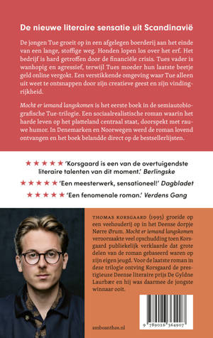 ‘Meesterverteller Korsgaaard geeft [hoofdpersoon Tue] woorden als stompen in de maag.’ - Nederlands Dagblad
