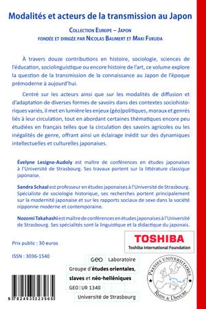 À travers douze contributions en histoire, sociologie, sciences de l’éducation, sociolinguistique ou encore histoire de l’art, ce volume explore la question de la transmission de la connaissance au Japon de l’époque prémoderne à aujourd’hui.