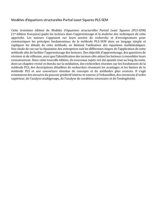 Modèles d’équations structurelles Partial Least Squares (PLS-SEM) est le manuel de référence en langue française sur la méthode statistique PLS. Cet ouvrage guide les lecteurs dans l'apprentissage et la maîtrise de cette approche dans un langage clair et accessible.