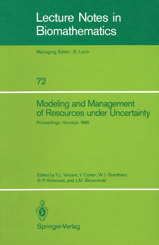 This vol ume contains the proceedings of the second U. S. -Austral ia workshop on Renewable Resource Management held at the East-West Center, Honolulu, Hawaii, December 9-12, 1985. The workshop was jointly sponsored by the National Science Foundation (USA) and the Department of Science and Technology (Austral ia) under the U. S. -Austral ia Cooperative Science Program. The objective of the workshop was to focus on problems associated with the management of renewable resource systems. A particular emphasis was given to methods for handling uncertain elements whieh are present in any real system. Toward this end, the partiei pants were chosen so that the collective expertise included mathematical modeling, dynamical control/game theory, ecology, and practical management of real systems. Each participant was invited to give an informal presentation in his field of expertise as related to the overall theme. The formal papers (contained in this vo 1 ume) were written after the workshop so that the authors coul d util ize the workshop experience in relating their own work to others. To further encourage this exchange, each paper contained in this volume was reviewed by two other participants who then wrote formal comments. These comments (with author's reply in some cases) are attached to the end of each paper.