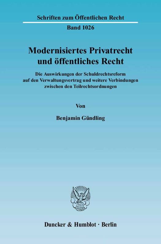 In einem Ersten Teil werden zunächst auf abstrakter Ebene anhand u. a. des Verbraucherschutz-, Kauf-, Verbandsklage- und Verjährungsrechts neue verbindende Systemgedanken zwischen den Teilrechtsordnungen herausgearbeitet. Den inhaltlichen Schwerpunkt bilden die Auswirkungen der Schuldrechtsmodernisierung auf den Verwaltungsvertrag im Zweiten Teil. Unter Berücksichtigung aktueller Reformbestrebungen zu den dogmatischen Grundlagen des Verwaltungsvertrags wird anhand von Beispielen aus dem Subventions-, Umwelt-, Bau-, Energiewirtschafts-, Privatisierungs-, Vergabe- oder Kommunalrecht die Anwendbarkeit des modernisierten AGB- und Leistungsstörungsrechts untersucht.