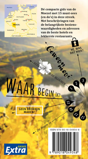 Beleef de Moezel met de compleet vernieuwde reisgids ANWB Extra Moezel! Van bron tot monding stroomt de ongeveer 500 km lange Moezel door drie landen. Vanaf de steile wijnhellingen aan de oever ontvouwt zich op veel plaatsen een adembenemend uitzicht op het slingerende lint van de rivier.