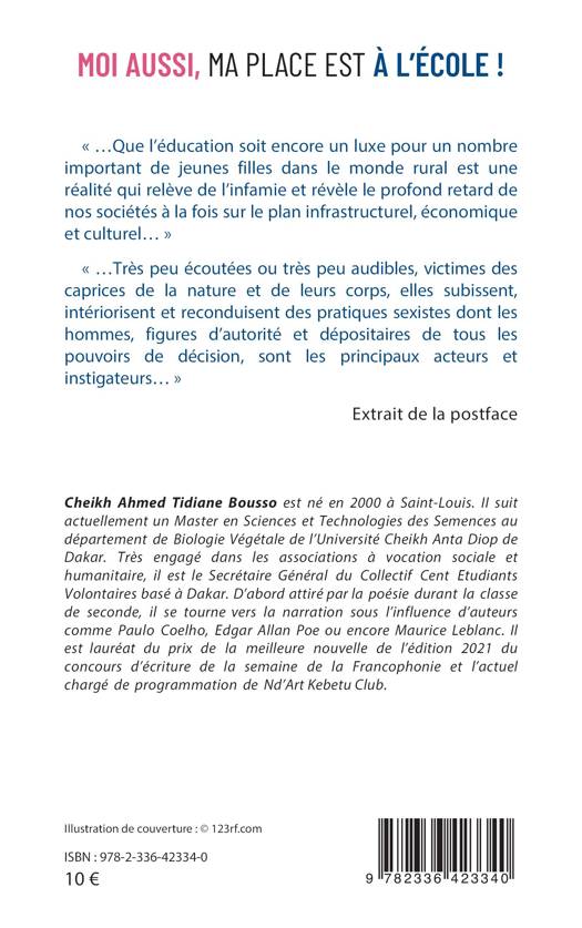 ...Que l'éducation soit encore un luxe pour un nombre important de jeunes filles dans le monde rural est une réalité qui relève de l'infamie et révèle le profond retard de nos sociétés à la fois sur le plan infrastructurel, économique et culturel... ...Très peu écoutées ou très peu audibles, victimes des caprices de la nature et de leurs corps, elles subissent, intériorisent et reconduisent des pratiques sexistes dont les hommes, figures d'autorité et dépositaires de tous les pouvoirs de décision, sont les principaux acteurs et instigateurs... Extrait de la Postface