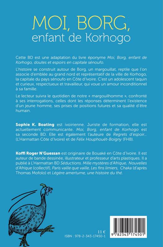 Cette BD est une adaptation du livre éponyme Moi, Borg, enfant de Korhogo, doutes et espoirs en capitale sénoufo. L’histoire se construit autour de Borg, un margouillat, reptile que l’on associe d’emblée au grand nord et représentatif de la ville de Korhogo, la capitale du pays sénoufo en Côte d’Ivoire. C’est un adolescent taquin et curieux, respectueux et travailleur, qui voue un amour inconditionnel à sa famille. Le lecteur suivra le quotidien de notre « margouilhomme », confronté à ses interrogations, celles dont les réponses déterminent l’existence d’un jeune homme, ses prises de positions futures et sa qualité d’être humain.