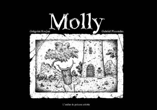Molly habite toute seule dans une vieille demeure, de celles que l’on peut voir dans les films d’horreur. Une nuit, elle tombe nez à nez avec un fantôme… mais l’histoire ne fait que commencer ! Auteur maison s’il en est – particulièrement prolixe, avec une quinzaine de titres à notre catalogue – Grégoire Kocjan nous propose une nouvelle histoire improbable. Il y ménage le suspens avec le même brio qu’à son habitude et continue de distiller avec finesse ses critiques acerbes de notre société. Et si Molly, son personnage, évolue dans un univers dantesque et nous transmet un peu d’inquiétude, ce n’est que pour mieux surprendre son lecteur, avec une chute toujours aussi inattendue. Gabriel Pissondes, intrigant illustrateur, à la technique sombre et pour le moins… pointilleuse (!), était assurément l’homme de la situation.