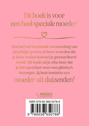 Dit boek is voor een heel speciale moeder! Een hartverwarmende verzameling van prachtige quotes en lieve woorden die je laten voelen hoeveel je gewaardeerd wordt. Dit boek zal je elke keer dat je het openslaat weer een glimlach bezorgen. Jij bent tenslotte een moeder uit duizenden!