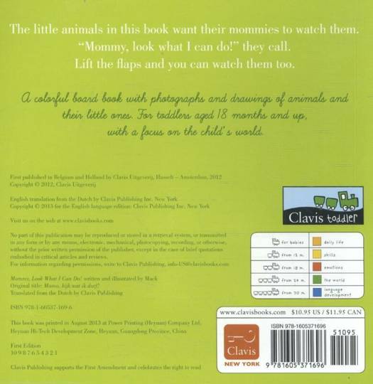 The little animals in this book want their mommies to watch them. "Mommy, look what I can do!" they call. Lift the flaps and you can watch them too. A penguin chick slides down a steep hill, a little orangutan reach for bananas, and a baby dolphin jumps out of the water, just like his mother. This colorful board book contains both photographs and drawings of animals and their little ones in their environments that young readers can also explore.