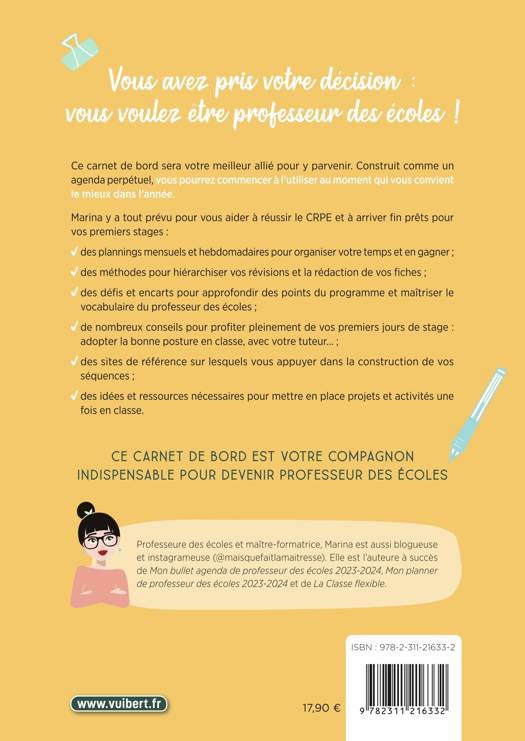 Professeure des écoles et maître-formatrice, Marina est aussi blogueuse et instagrameuse (@maisquefaitlamaitresse) et l’auteure de Mon Bullet agenda de professeur des écoles 2023-2024, du Planner de professeur des écoles2023-2024 et de La Classe flexible.