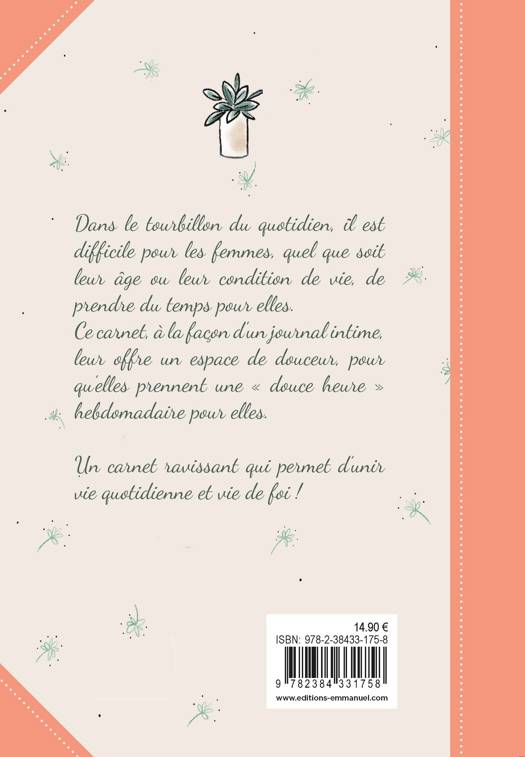 Dans le tourbillon du quotidien, il est difficile pour les femmes de prendre du temps pour elles. Ce carnet, à la façon d'un journal intime, leur offre un espace de douceur, pour qu'elles prennent une "douce heure" hebdomadaire pour elles. Magnifiquement illustré par Anne-Charlotte Larroque, il se place dans la lignée de "Mon carnet de gratitude" et permet d'unir vie quotidienne et vie de foi dans un carnet ravissant. Le cadeau idéal pour la fête des mères !