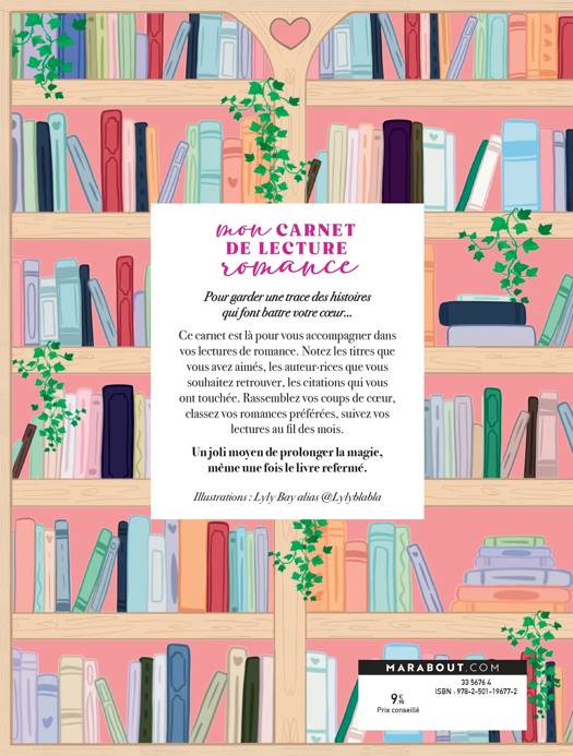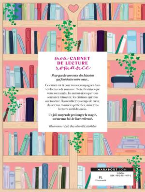 Ce carnet est là pour vous accompagner dans vos lectures de romance. Notez les titres que vous avez aimés, les auteur·rices que vous souhaitez retrouver, les citations qui vous ont touchée. Rassemblez vos coups de cœur, classez vos romances préférées, suivez vos lectures au fil des mois.