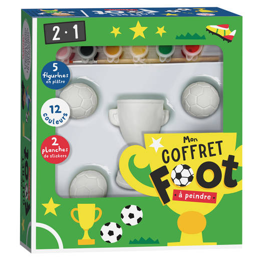 Dans ce coffret, les jeunes enfants -et les plus grands- vont trouver 5 figurines en plâtre (4 ballons et 1 coupe), 12 petits pots de peinture, 2 pinceaux en bois (un plat et un fin), 10 cartes à colorier et 2 planches de stickers pour réaliser de superbes décorations. Une chouette activité créative à partager en famille !