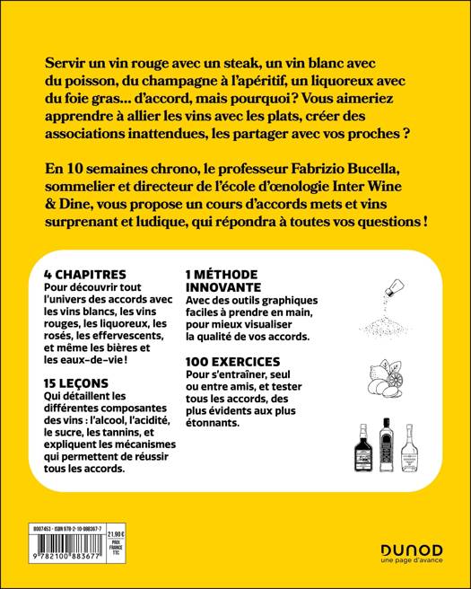 Servir un vin rouge avec un steak, un vin blanc avec du poisson, du champagne à l’apéritif, un liquoreux avec du foie gras… d’accord, mais pourquoi ? Vous aimeriez comprendre comment fonctionnent les accords entre les vins et les mets, créer des associations inattendues, les partager avec vos proches. En 10 semaines chrono, le professeur Fabrizio Bucella, sommelier et directeur de l’école d’œnologie Inter Wine & Dine, vous propose un cours d’accords mets et vins surprenant et ludique, qui répondra à toutes vos questions ! 1 méthode innovante avec des outils graphiques faciles à prendre en main, pour mieux visualiser la qualité de vos accords. 4 chapitres pour découvrir tout l’univers des accords avec les vins blancs, les vins rouges, les liquoreux, les rosés, les effervescents, et même les bières et les eaux-de-vie ! 15 leçons qui détaillent les différentes composantes des vins : l’alcool, l’acidité, le sucre, les tannins, et expliquent les mécanismes qui permettent de réussir tous les accords. 100 exercices avec leurs corrigés pour s’entraîner, seul ou entre amis, et tester tous les accords, des plus évidents aux plus étonnants.