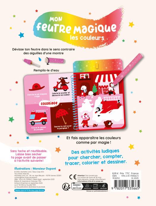 Des activités ludiques pour chercher, tracer, compter, colorier sur la thématique des couleurs, avec un feutre à réservoir à eau. L'enfant passe sur les pages et fait apparaître comme par magie les images et les couleurs pour ensuite disparaître.