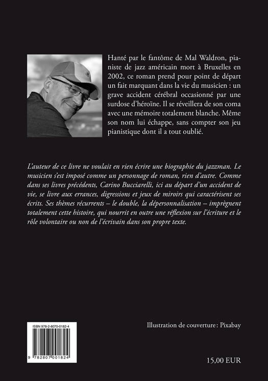 Hanté par le fantôme de Mal Waldron, pianiste de jazz américain mort à Bruxelles en 2002, ce roman prend pour point de départ un fait marquant dans la vie du musicien : un grave accident cérébral occasionné par une surdose d'héroïne. Il se réveillera de son coma avec une mémoire totalement blanche. Même son nom lui échappe, sans compter son jeu pianistique dont il a tout oublié. L'auteur de ce livre ne voulait en rien écrire une biographie du jazzman. Le musicien s'est imposé comme un personnage de roman, rien d'autre. Comme dans ses livres précédents, Carino Bucciarelli, ici au départ d'un accident de vie, se livre aux errances, digressions et jeux de miroirs qui caractérisent ses écrits. Ses thèmes récurrents - le double, la dépersonnalisation - imprègnent totalement cette histoire, qui nourrit en outre une réflexion sur l'écriture et le rôle volontaire ou non de l'écrivain dans son propre texte.