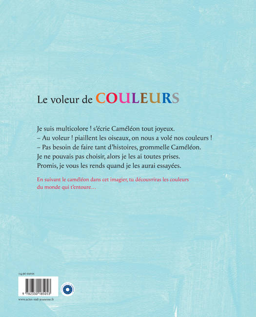 Dans ce livre, chaque double page présente une couleur et ses nuances à travers une foule d'objets familiers : les produits laitiers pour le blanc, les animaux d'Afrique pour le gris, les chaussures pour le noir. Tasses, bouilloires et cafetières se déclinent en toutes sortes de bleus, lézards et batraciens en vert, engins de construction en jaune, fruits en orange, vêtements en rouge... Le caméléon, lui, nous livre un joli poème pour nous accompagner dans chacune de ces couleurs et, bien sûr, change de robe à chaque fois ! Un livre parfait pour apprendre les noms des couleurs, et pour élargir son vocabulaire. Et aussi un magnifique travail d'artiste !