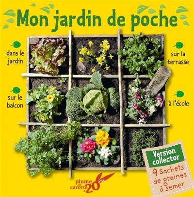 À l’occasion de ses 20 ans, Plume de carotte réédite son PREMIER livre publié au printemps 2001 : Mon jardin de poche ! Cet ouvrage n’a pas pris une ride, bien au contraire ! L’art du micro jardin pédagogique, que l’on peut installer sur un simple balcon ou dans la cour d’une école, a vu son sens et son intérêt renforcés avec la prise de conscience de notre société des enjeux environnementaux… Mon jardin de poche c’est une expérience à partager en famille ou même en classe. C’est un livre-coffret qui contient plusieurs supports pratiques, pédagogiques et ludiques pour installer son jardin carré, d’à peine 1 m sur 1 m, sur la terrasse de la maison, dans le jardin ou dans la cour de l’école ! À l’intérieur de ce coffret : - un livret de fabrication avec toutes les indications pour construire son jardin de poche et apprendre à bien y jardiner, - un livret de culture avec les conseils de culture de plus de 70 plantes que l’on peut faire pousser dans le jardin de poche, - sept fiches présentant des jardins thématiques : jardin aromatique, musical, d’artiste, du goût, d’oiseaux, d’insectes, scientifique, - un poster-calendrier avec des vignettes à coller pour connaître les moments de semis, de plantation, de récolte des plantes, - des petites vignettes à découper afin de les placer sur le postercalendrier. - Et le plus collector : 9 sachets de graines pour bien démarrer son jardin de poche : coquelicots, basilic, tournesol, cresson, radis, blé… Tout ce qu’il faut pour se lancer le défi de créer un jardin minuscule, où on peut semer, planter, arroser et récolter des légumes, des fruits, des aromates et des fleurs à foison, comme dans un « vrai jardin » !