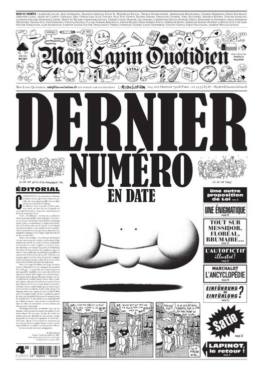 La fanfare de L’Association revient avec le n° 2 de Mon Lapin quotidien, le quotidien du trimestre. Après un n°1 remarqué, ce dernier numéro en date sera à la hauteur, ainsi qu’à la largeur du premier : MLQ fera à nouveau la part belle au dessin, avec des auteurs comme David B., José Parrondo, Killoffer, Thomas Ott, Ruppert & Mulot, Stéphane Trapier ou Fabio Viscogliosi, au texte avec des chroniques de Denis Robert, Pacôme Thiellement, Raphaël Meltz, Jean-Yves Duhoo, Aurélie William Levaux, Clémentine Mélois, Thomas Baumgartner, Christian Rosset ou Éric Chevillard, à la bande dessinée avec Lewis Trondheim, Berberian, Emmanuel Guibert, Dorothée de Monfreid, Vanoli, Lisa Mandel, Placid, Jochen Gerner, Julie Doucet, Nicolas Malher ou Étienne Lécroart, entre autres et non des moindres… MON LAPIN QUOTIDIEN, le journal impossible à plier mais possible à publier, vous informera à nouveau sur tout un tas de sujets dont vous pensiez vous foutre éperdument jusqu’à présent, sans savoir qu’il vous passionnent quand c’est Mon Lapin quotidien qui vous en parle, à sa façon inimitable, toujours dans un élégant noir et blanc mariant texte, image et typographie moderne.