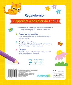 Grâce à ce livre d’exercices pour jeunes enfants, votre petit trésor apprendra à compter de 1 à 10 tout en s’amusant. Chaque double page est consacrée à un chiffre : il y a un exercice d’écriture,un exercice de calcul et un dessin à colorier !