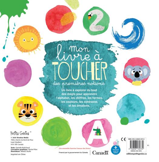 Ce livre tactile se veut une introduction ludique aux notions de base de la préparation scolaire grâce aux thèmes explorés: l'alphabet, les chiffres, les couleurs, les contraires, les formes et les émotions. Les enfants adoreront l'univers tactile stimulant aux effets texturés différents de page en page.