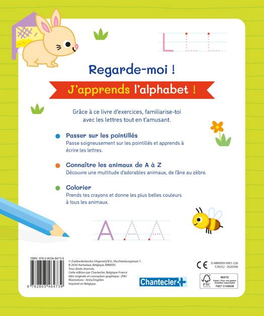 Grâce à ce livre d’exercices pour jeunes enfants, votre petit trésor apprendra les lettres de l’alphabet tout en s’amusant. Chaque page est consacrée à une lettre : il y a un dessin à colorier d’un animal dont le nom commence par cette lettre et un exercice d’écriture !