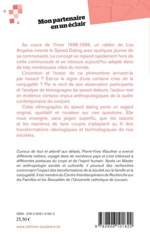 Cette ethnographie du speed dating porte un regard original et novateur sur le paradigme du couple contemporain. Considérant l'émergence et la renommée du speed dating comme la marque de son temps, l'auteur met en évidence les enjeux anthropologiques de la quête contemporaine du conjoint. Il expose, sans jargon superflu, comment les raisons et les manières de faire couple s'adaptent au fil des transformations idéologiques et technologiques de nos sociétés.