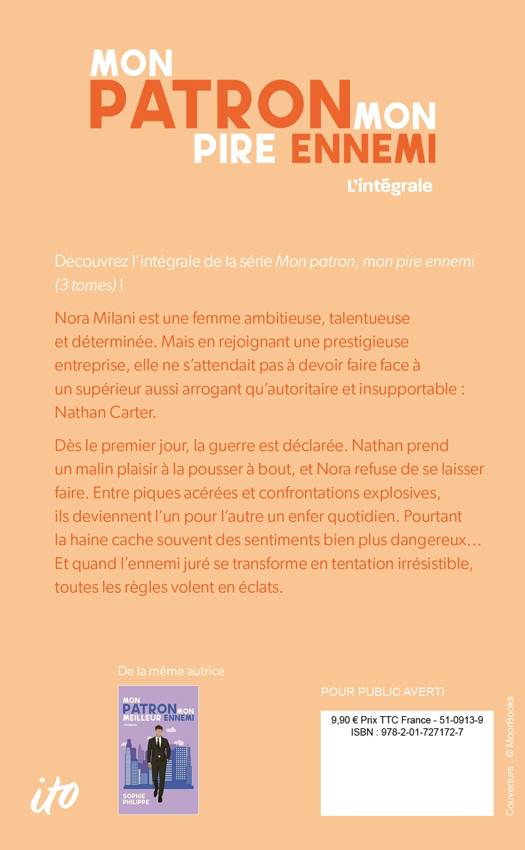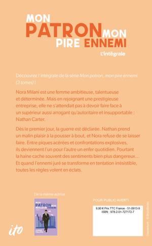 Découvre l'intégrale de la série Mon patron, mon pire ennemi ! Nora Milani est une femme ambitieuse, talentueuse et déterminée. Mais en rejoignant une prestigieuse entreprise, elle ne s’attendait pas à devoir faire face à un supérieur aussi arrogant qu’autoritaire et insupportable : Nathan Carter. Dès le premier jour, la guerre est déclarée. Nathan prend un malin plaisir à la pousser à bout, et Nora refuse de se laisser faire. Entre piques acérées et confrontations explosives, ils deviennent l’un pour l’autre un enfer quotidien. Pourtant la haine cache souvent des sentiments bien plus dangereux… Et quand l’ennemi juré se transforme en tentation irrésistible, toutes les règles volent en éclats.