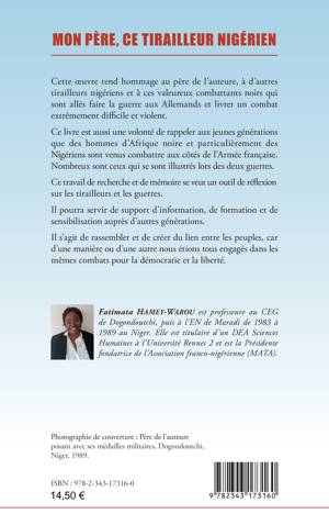 Ce livre rend hommage au père de l’auteure, à d’autres tirailleurs nigériens et à ces valeureux combattants noirs qui sont allés faire la guerre aux Allemands et livrer un combat extrêmement difficile et violent.