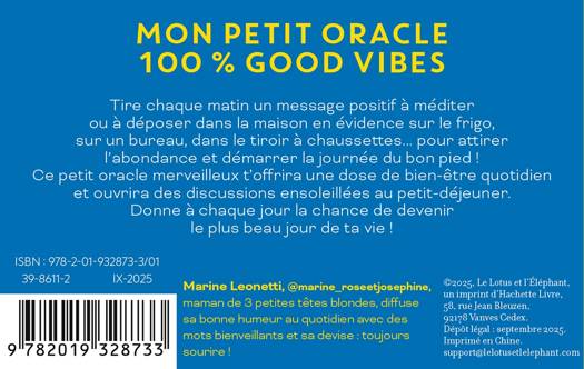 Ce petit oracle merveilleux t’offrira une dose de bien-être quotidien et ouvrira des discussions ensoleillées au petit-déjeuner. Donne à chaque jour la chance de devenir le plus beau jour de ta vie !