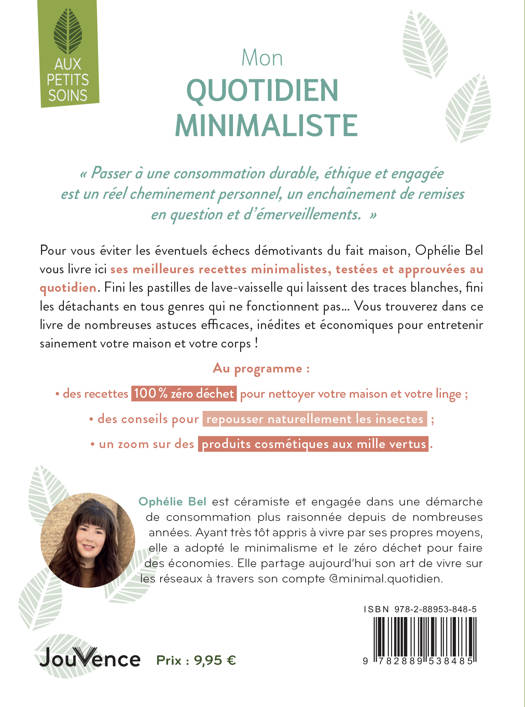 « Passer à une consommation durable, éthique et engagée est un réel cheminement personnel, un enchaînement de remises en question et d’émerveillements. » Pour vous éviter les éventuels échecs démotivants du fait maison, Ophélie Bel vous livre ici ses meilleures recettes minimalistes, testées et approuvées au quotidien. Fini les pastilles de lave-vaisselle qui laissent des traces blanches, fini les détachants en tous genres qui ne fonctionnent pas… Vous trouverez dans ce livre de nombreuses astuces efficaces, inédites et économiques pour entretenir sainement votre maison et votre corps ! Au programme : • des recettes 100?% zéro déchet pour nettoyer votre maison et votre linge ; • des conseils pour repousser naturellement les insectes ; • un zoom sur des produits cosmétiques aux mille vertus.