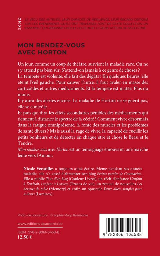 Un jour, comme un coup de théâtre, survient la maladie rare. On ne s'y attend pas bien sûr. S'attend-on jamais à ce genre de choses ? La tempête est violente, elle fait des dégâts ! En quelques heures, elle éteint l'oeil gauche. Pour sauver l'autre, il faut avaler en masse des corticoïdes et autres médicaments. Et la tempête est matée. Plus ou moins. Il y aura des alertes encore. La maladie de Horton ne se guérit pas, elle se contrôle...