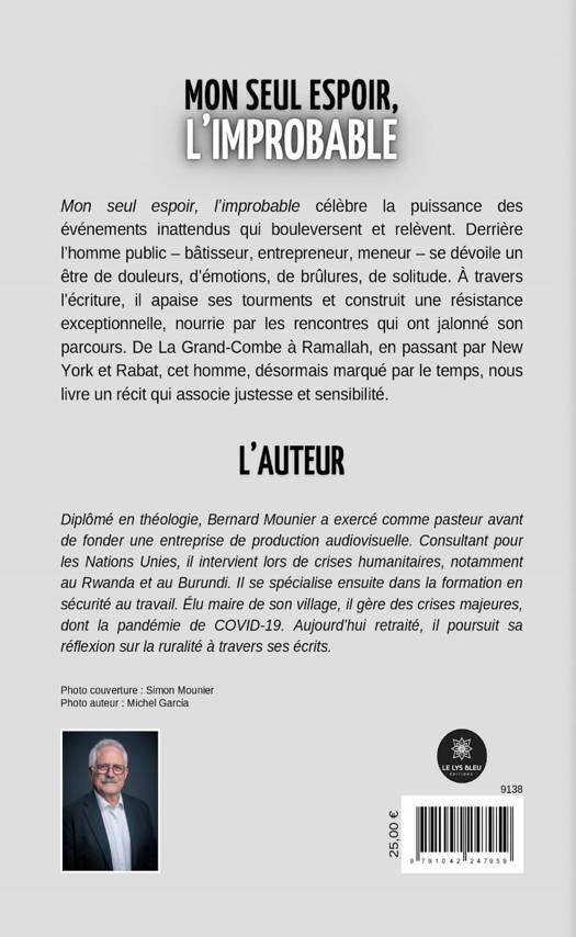 Mon seul espoir, l'improbable célèbre la puissance des événements inattendus qui bouleversent et relèvent. Derrière l'homme public - bâtisseur, entrepreneur, meneur - se dévoile un être de douleurs, d'émotions, de brûlures, de solitude. À travers l'écriture, il apaise ses tourments et construit une résistance exceptionnelle, nourrie par les rencontres qui ont jalonné son parcours. De La Grand-Combe à Ramallah, en passant par New York et Rabat, cet homme, désormais marqué par le temps, nous livre un récit qui associe justesse et sensibilité.