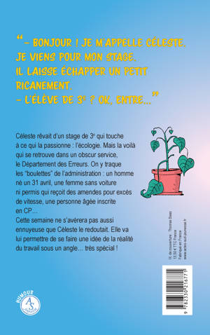 Céleste rêvait d'un stage de 3e qui touche à ce qui la passionne : l'écologie. Mais la voilà qui se retrouve dans un obscur service, le Département des Erreurs. On y traque les "boulettes" de l'administration : un homme né un 31 avril, une femme sans voiture ni permis qui reçoit des amendes pour excès de vitesse, une personne âgée inscrite en CP ... Cette semaine ne s'avérera pas aussi ennuyeuse que Céleste le redoutait. Elle va lui permettre de se faire une idée de la réalité du travail sous un angle ... très spécial !