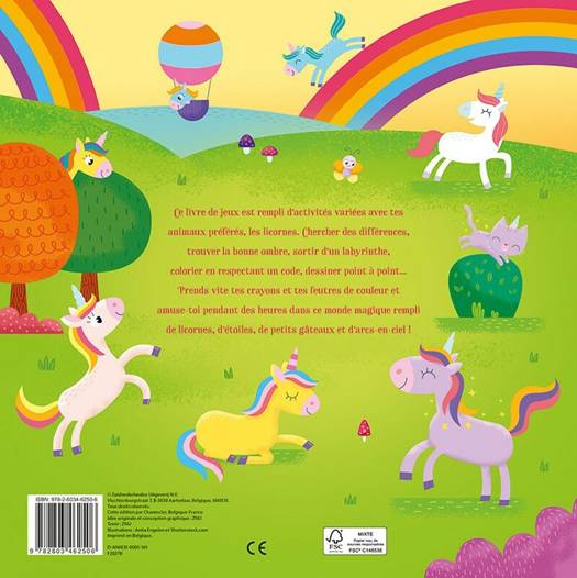 Un livre rempli d'activités amusantes avec tes animaux préférés, les licornes. Chercher des différences, trouver la bonne ombre, sortir d'un labyrinthe, colorier en respectant un code, dessiner point à point… Prends vite tes crayons et tes feutres de couleur et amuse-toi pendant des heures dans ce monde magique rempli de licornes, d'étoiles, de petits gâteaux et d'arcs-en-ciel ! Les solutions sont à la fin du livre
