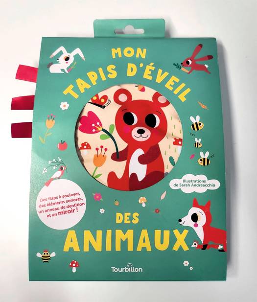 Cet objet très riche permet une première exploration sensorielle pour bébé : des flaps à soulever, des éléments sonores, du papier crissant, un anneau de dentition... et un miroir !