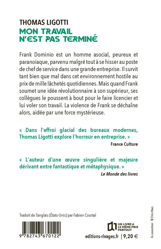 Frank Dominio est un homme craintif et paranoïaque parvenu malgré tout à se hisser au poste de chef de service dans une grande entreprise. Mais quand ses collègues se liguent contre lui, la violence de Frank se déchaine. Aidé par une force mystérieuse, il raffine sa vengeance pour faire payer à chacun de ses bourreaux des années de honte et d'humiliation. L'unique roman du nouvelliste Thomas Ligotti, récipiendaire de quatre prix Bram Stoker, considéré comme le principal héritier de Lovecraft.