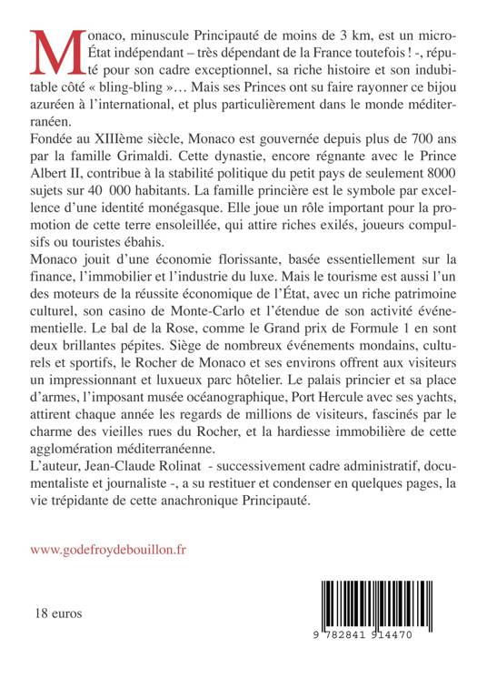 Monaco, minuscule Principauté de moins de 3 km, est un microté pour son cadre exceptionnel, sa riche histoire et son indubitable côté « bling-bling »... Mais ses Princes ont su faire rayonner ce bijou azuréen à l'international, et plus particulièrement dans le monde méditer- ranéen. Fondée au XIllème siècle, Monaco est gouvernée depuis plus de 700 ans par la famille Grimaldi. Cette dynastie, encore régnante avec le Prince Albert II, contribue à la stabilité politique du petit pays de seulement 8000 sujets sur 40 000 habitants. La famille princière est le symbole par excellence d'une identité monégasque. Elle joue un rôle important pour la promotion de cette terre ensoleillée, qui attire riches exilés, joueurs compulsifs ou touristes ébahis. Monaco jouit d'une économie florissante, basée essentiellement sur la finance, l'immobilier et l'industrie du luxe. Mais le tourisme est aussi l'un des moteurs de la réussite économique de l'État, avec un riche patrimoine culturel, son casino de Monte-Carlo et l'étendue de son activité événementielle. Le bal de la Rose, comme le Grand prix de Formule 1 en sont deux brillantes pépites. Siège de nombreux événements mondains, culturels et sportifs, le Rocher de Monaco et ses environs offrent aux visiteurs un impressionnant et luxueux parc hôtelier. Le palais princier et sa place d'armes, l'imposant musée océanographique, Port Hercule avec ses yachts, attirent chaque année les regards de millions de visiteurs, fascinés par le charme des vieilles rues du Rocher, et la hardiesse immobilière de cette agglomération méditerranéenne. L'auteur, Jean-Claude Rolinat - successivement cadre administratif, documentaliste et journaliste -, a su restituer et condenser en quelques pages, la vie trépidante de cette anachronique Principauté.