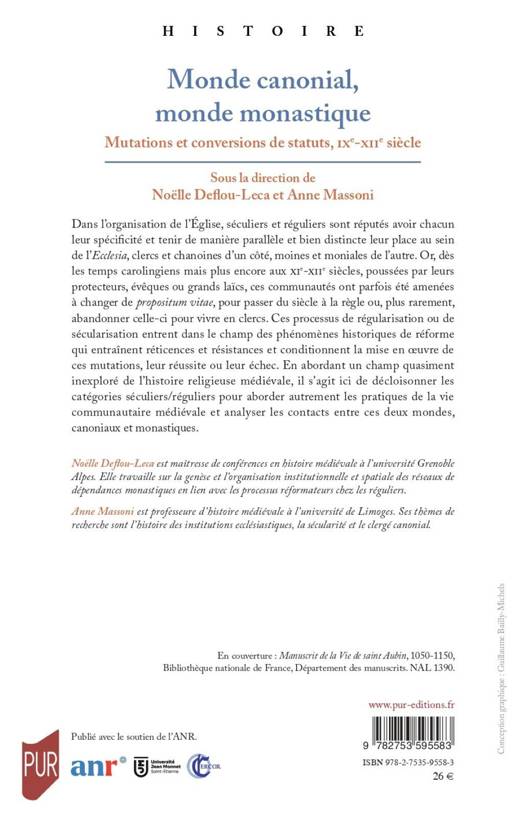 Dans l’organisation de l’Église, séculiers et réguliers sont réputés avoir chacun leur spécificité et tenir de manière parallèle et bien distincte leur place au sein de l’Ecclesia, clercs et chanoines d’un côté, moines et moniales de l’autre. Or, dès les temps carolingiens mais plus encore aux XIe-XIIe siècles, poussées par leurs protecteurs, évêques ou grands laïcs, ces communautés ont parfois été amenées à changer de propositum vitae, pour passer du siècle à la règle ou, plus rarement, abandonner celle-ci pour vivre en clercs. Ces processus de régularisation ou de sécularisation entrent dans le champ des phénomènes historiques de réforme qui entraînent réticences et résistances et conditionnent la mise en oeuvre de ces mutations, leur réussite ou leur échec. En abordant un champ quasiment inexploré de l’histoire religieuse médiévale, il s’agit ici de décloisonner les catégories séculiers/réguliers pour aborder autrement les pratiques de la vie communautaire médiévale et analyser les contacts entre ces deux mondes, canoniaux et monastiques.
