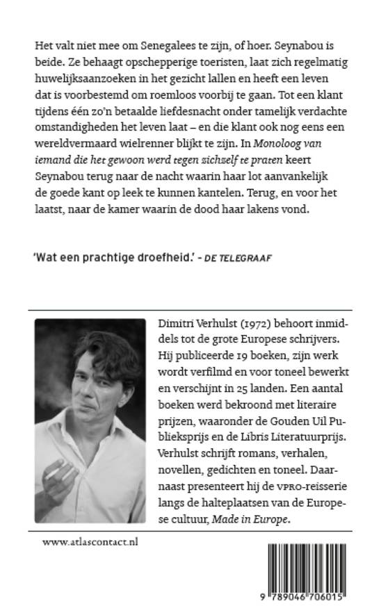 Dimitri Verhulst laat in 'Monoloog van iemand die het gewoon werd tegen zichzelf te praten' zien dat het niet meevalt om Senegalees te zijn, of hoer. Seynabou is beide. Ze behaagt opschepperige toeristen, laat zich regelmatig huwelijksaanzoeken in het gezicht lallen en heeft een leven dat is voorbestemd om roemloos voorbij te gaan. Tot een klant tijdens één zo'n betaalde liefdesnacht onder tamelijk verdachte omstandigheden het leven laat – en die klant ook nog eens een wereldvermaard wielrenner blijkt te zijn. In Monoloog van iemand die het gewoon werd tegen zichzelf te praten keert Seynabou terug naar de nacht waarin haar lot aanvankelijk de goede kant op leek te kunnen kantelen. Terug, en voor het laatst, naar de kamer waarin de dood haar lakens vond.