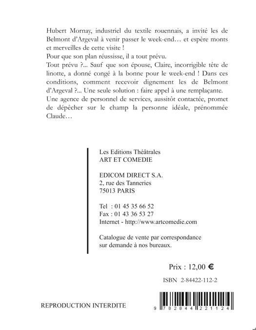 Hubert Mornay, industriel du textile rouennais, a invité les de Belmont d'Argeval à venir passer le week-end... et espère monts et merveilles de cette visite ! Pour que son plan réussisse, il a tout prévu. Tout prévu ?... Sauf que son épouse, Claire, incorrigible tête de linotte, a donné congé à la bonne pour le week-end ! Dans ces conditions, comment recevoir dignement les de Belmont d'Argeval ?... Une seule solution: faire appel à une remplaçante. Une agence de personnel de services, aussitôt contactée, promet de dépêcher sur le champ la personne idéale, prénommée Claude...