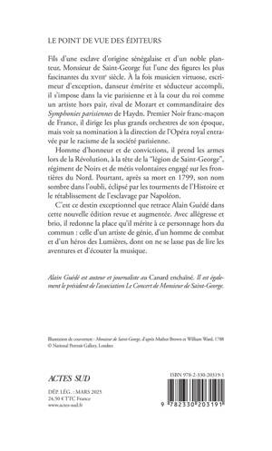 Né en 1739 à Basse-Terre d'une esclave d'origine sénégalaise et d'un planteur noble, le beau mulâtre apparaît aujourd'hui comme l'une des figures les plus romanesques du XVIIIe siècle. C'est le destin exceptionnel de ce répudié de l'histoire que retrace ici Alain Guédé, avec une allégresse et un brio qui rendent hommage à la vitalité et à la prééminence dans son siècle du grand Saint- George, dont on ne se lasse pas de lire les aventures et d'écouter la musique.