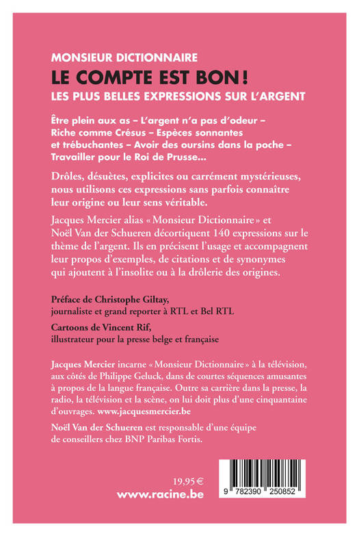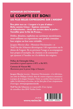 Jacques Mercier alias « Monsieur Dictionnaire » et Noël Van der Schueren décortiquent 140 expressions sur le thème de l'argent. Ils en précisent l'usage et accompagnent leur propos d'exemples, de citations et de synonymes qui ajoutent à l'insolite ou à la drôlerie des origines.