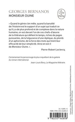 « Mais quand le génie s'en mèle, quand la banalité de l'histoire est le support d'un sujet qui traduit ce qu'il y a de plus profond et de complexe dans la nature humaine, on est devant l'un de ces chefs-d'oeuvre de la littérature qui défient le temps, riches de pages puissantes, de la fulgurance d'une réplique, du plomb d'un aphorisme, de la force des mots qui tirent leur efficacité de leur simplicité. Ainsi en est-il de Monsieur Ouine. » Pierre-Robert Leclercq Certainement le personnage le plus inquiétant de la galerie du roman international (Jean-Louis Bory, Le Magazine littéraire)