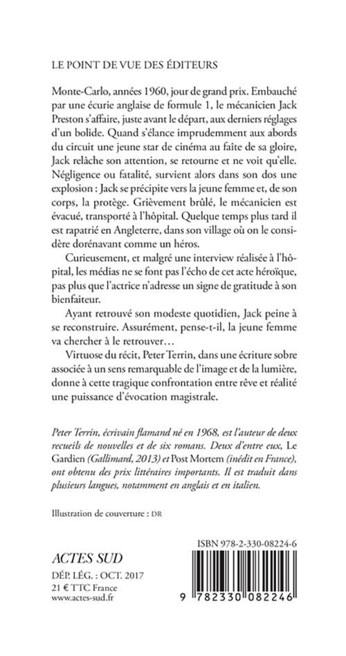Monte-Carlo, années 1960, jour de grand prix. Embauché par une écurie anglaise de formule 1, le mécanicien Jack Preston s'affaire, juste avant le départ, aux derniers réglages d'un bolide. Quand s'élance imprudemment aux abords du circuit une jeune star de cinéma au faîte de sa gloire, Jack relâche son attention, se retourne et ne voit qu'elle. Négligence ou fatalité, survient alors dans son dos une explosion : Jack se précipite vers la jeune femme et, de son corps, la protège. Grièvement brûlé, le mécanicien est évacué, transporté à l'hôpital. Quelque temps plus tard il est rapatrié en Angleterre, dans son village où on le considère dorénavant comme un héros. Curieusement, et malgré une interview réalisée à l'hôpital, les médias ne se font pas l'écho de cet acte héroïque, pas plus que l'actrice n'adresse un signe de gratitude à son bienfaiteur. Ayant retrouvé son modeste quotidien, Jack peine à se reconstruire. Assurément, pense-t-il, la jeune femme va chercher à le retrouver... Virtuose du récit, Peter Terrin, dans une écriture sobre associée à un sens remarquable de l'image et de la lumière, donne à cette tragique confrontation entre rêve et réalité une puissance d'évocation magistrale.