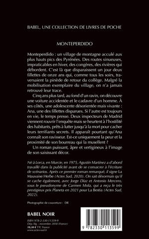 Monteperdido : un village de montagne acculé aux plus hauts pics des Pyrénées. Des routes sinueuses, impraticables en hiver, des congères, des rivières qui débordent. C'est là que disparaissent un jour deux fillettes de onze ans qui, comme tous les soirs, traversaient la pinède de retour du collège. Malgré la mobilisation exemplaire du village, on n'a jamais retrouvé leur trace.