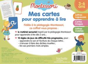 Fidèle à la pédagogie Montessori, ce coffret vous propose : • le matériel sensoriel inspiré par la pédagogie Montessori pour apprendre à lire dès 3 ans : 29 cartes rugueuses, 48 cartes images autocorrectives et 60 lettres mobiles. • 10 règles de jeux de difficulté très progressive, pour : - apprendre le son et l’écriture de chaque lettre ; - s’amuser à faire des dictées muettes ; - lire ses premiers mots simples !
