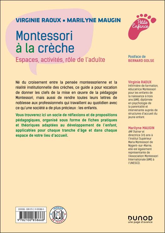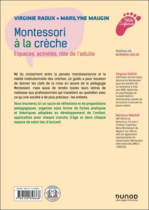 Né du croisement entre la pensée montessorienne et la réalité institutionnelle des crèches, ce guide a pour vocation de donner les clefs de la mise en œuvre de la pédagogie Montessori, mais aussi de rendre toutes leurs lettres de noblesse aux professionnels qui travaillent au quotidien avec ce qu’une société a de plus précieux : les enfants. Vous trouverez ici un socle de réflexions et de propositions pédagogiques, organisé sous forme de fiches pratiques et théoriques adaptées au développement de l’enfant, applicables pour chaque tranche d’âge et dans chaque espace de votre lieu d’accueil.