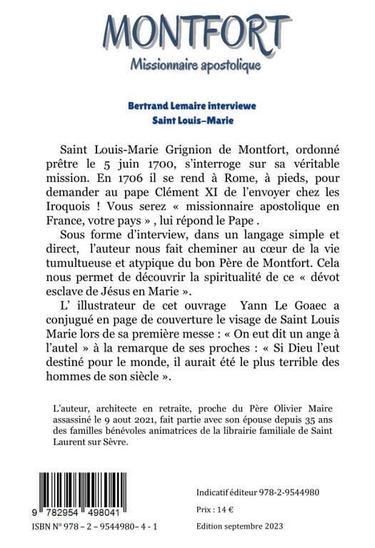 L'illustrateur de cet ouvrage Yann Le Goaec a conjugué en page de couverture le visage de Saint Louis Marie lors de sa première messe : « On eut dit un ange à l'autel » à la remarque de ses proches : « Si Dieu l'eut destiné pour le monde, il aurait été le plus terrible des hommes de son siècle ».