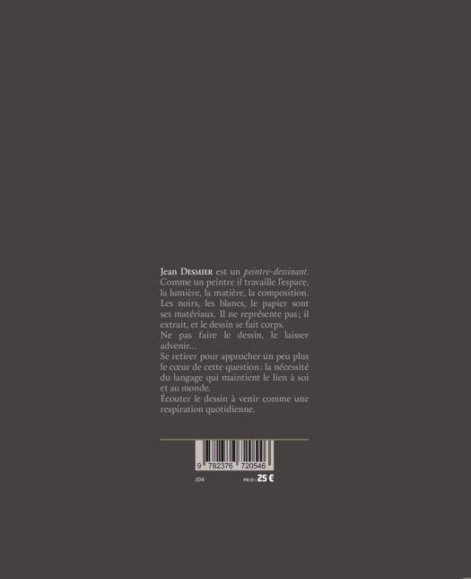Jean Desmier est un peintre-dessinant. Comme un peintre il travaille l’espace, la lumière, la matière, la composition. Les noirs, les blancs, le papier sont ses matériaux. Il ne représente pasâ; il extrait, et le dessin se fait corps.<br /> Ne pas faire le dessin, le laisser advenir...<br /> Se retirer pour approcher un peu plus le coeur de cette questionâ: la nécessité du langage qui maintient le lien à soi et au monde.<br /> Écouter le dessin à venir comme une respiration quotidienne.<br /><br /> Les dessins sont accompagnés d'un texte de Bruno Roza, et de fragments d'entretiens.<br /><br /> Le livre présente deux séries :<br /> ⢠Cartographies de l’émotion (dessins, 2020)<br /> ⢠Monuments de l’instant (dessins, 2021 – 2022)
