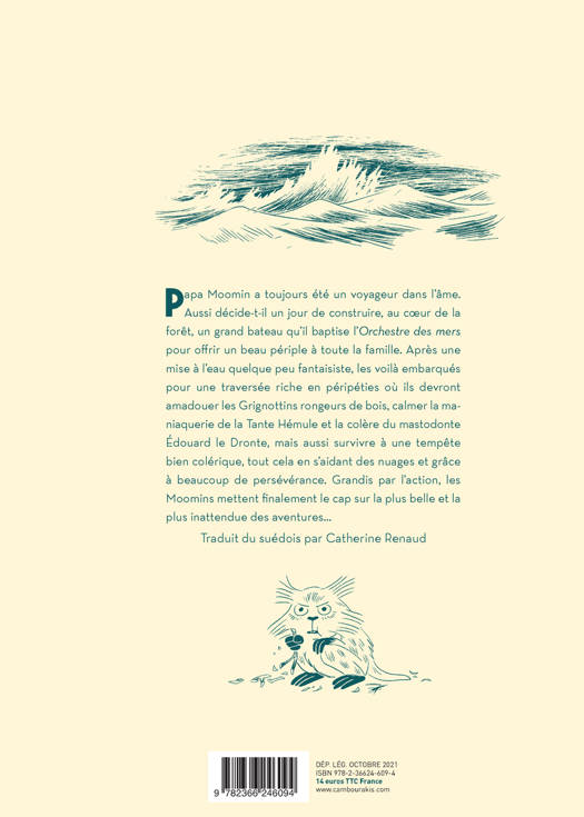 Papa Moomin a toujours été un voyageur dans l'âme. Aussi décide-t-il un jour de construire, au coeur de la forêt, un grand bateau qu'il baptise l'Orchestre des mers pour offrir un beau périple à toute la famille. Après une mise à l'eau quelque peu fantaisiste, les voilà embarqués pour une traversée riche en péripéties où ils devront amadouer les Grignottins rongeurs de bois, calmer la maniaquerie de la Tante Hémule et la colère du mastodonte Édouard le Dronte, mais aussi survivre à une tempête bien colérique, tout cela en s'aidant des nuages et grâce à beaucoup de persévérance. Grandis par l'action, les Moomins mettent finalement le cap sur la plus belle et la plus inattendue des aventures...